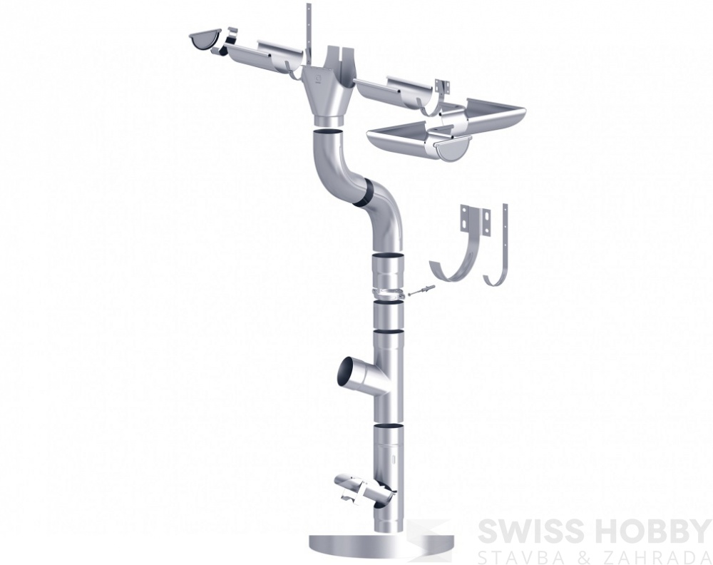 Za pomoci spojky svodových rour se na kotlík připevní svodové roury, které se poté každé 2 metry připevňují objímkou