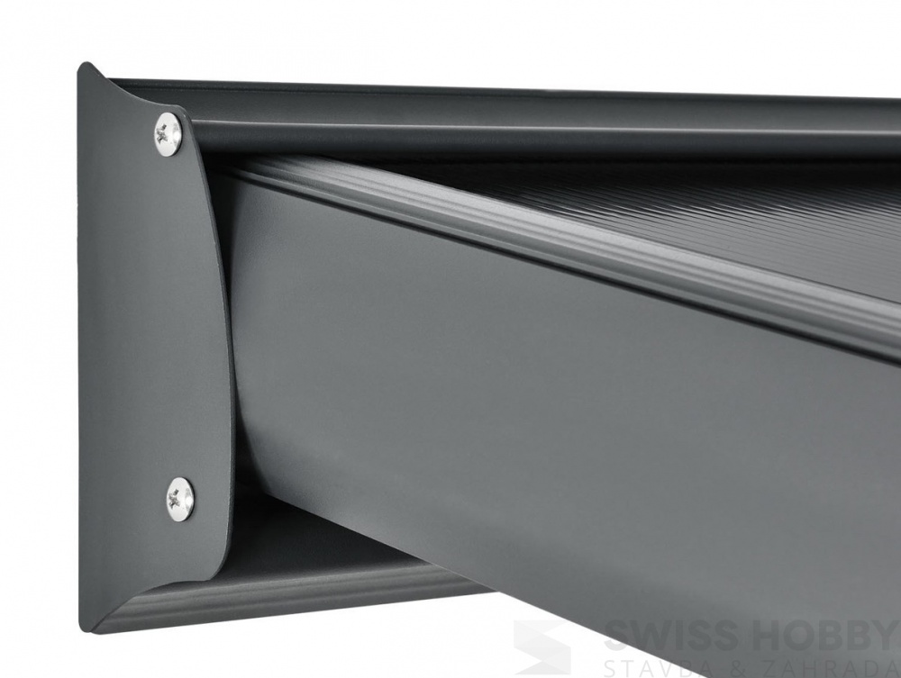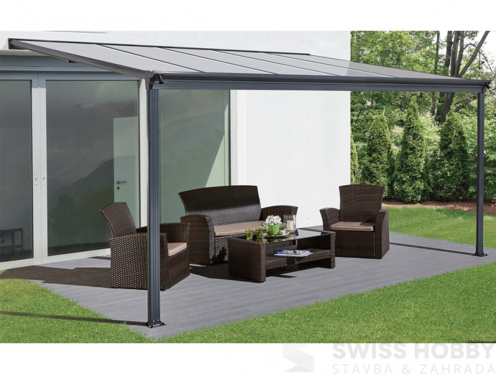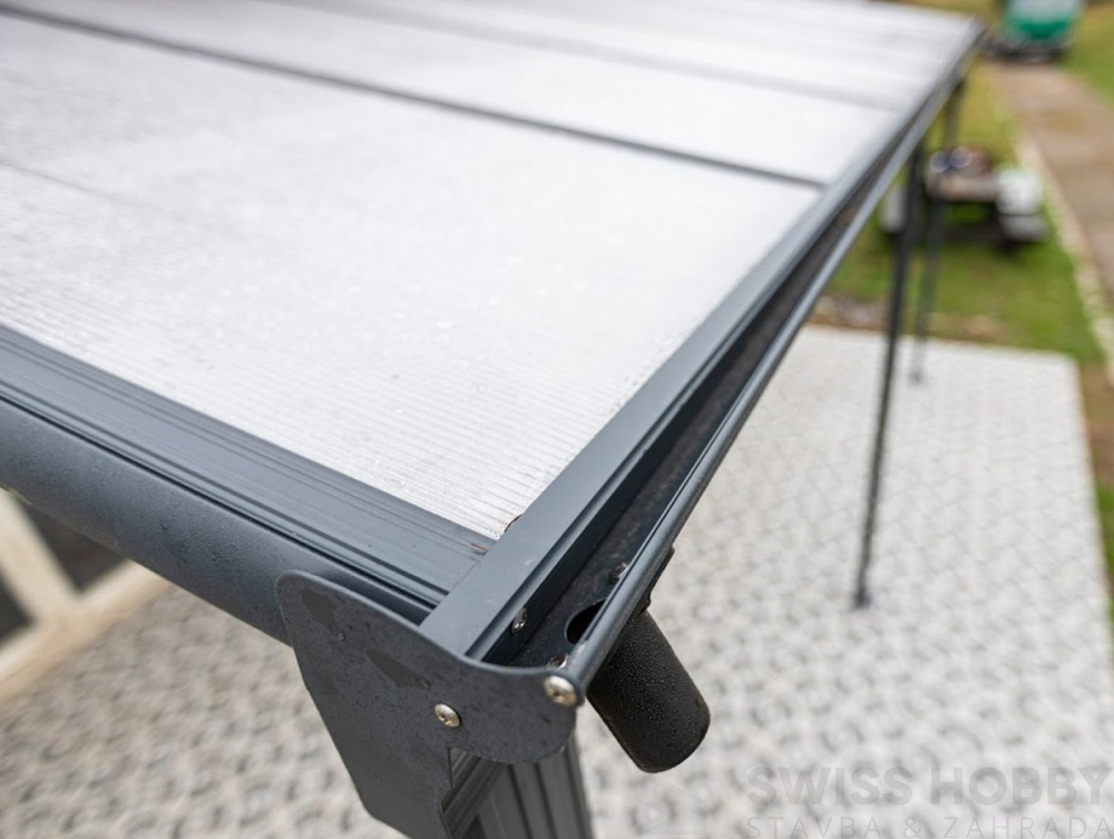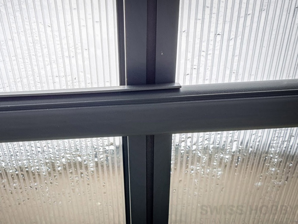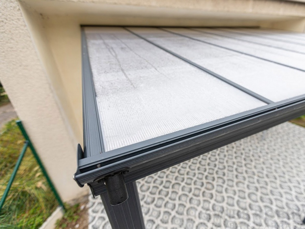 Hliníková pergola BW - Elegantní pergolu BW dodáváme v antracitové barvě s čirým či bronzovým polykarbonátem. Pergola je vyrobena z robustních hliníkových profilů s barevnou povrchovou úpravou.. Zastřešení řešeno komůrkovým polykarbonátem tloušťky 6 mm.