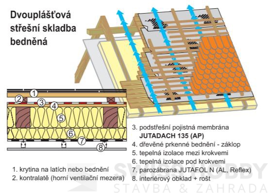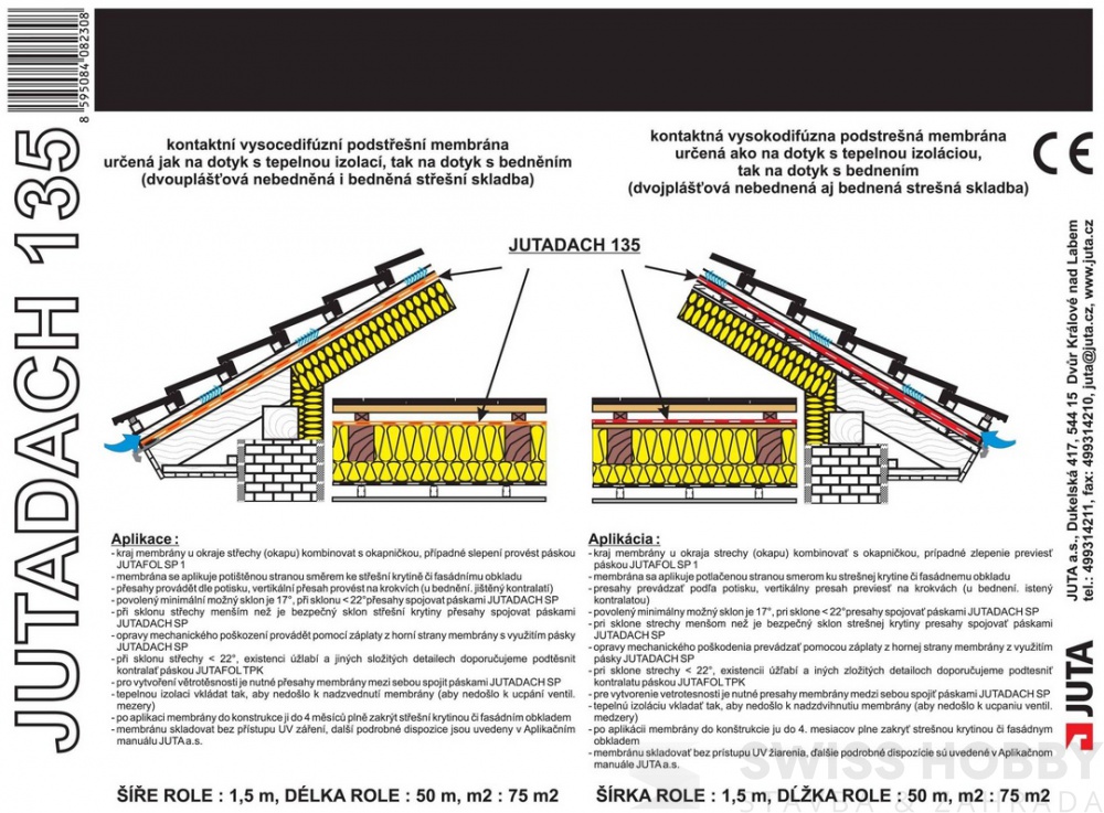JutaDACH 135 A. P. je vysoce difúzní fólie, která se skládá z difúzního filmu a dvou vrstev netkané polypropylenové textílie. Fólie je kontaktní a určená pro dotyk s tepelnou izolací. Dá se použít na bedněné i nebedněné střechy. JutaDACH 135 A. P. odvádí vodní páry z konstrukce ven, vytváří uzavřený systém pro tepelnou izolaci, která je chráněna před deštěm, sněhem, prachem a vlhkostí. Fólie nepodléha hnilobě ani plísním a navíc je zdravotně nezávadná a plně recyklovatelná.