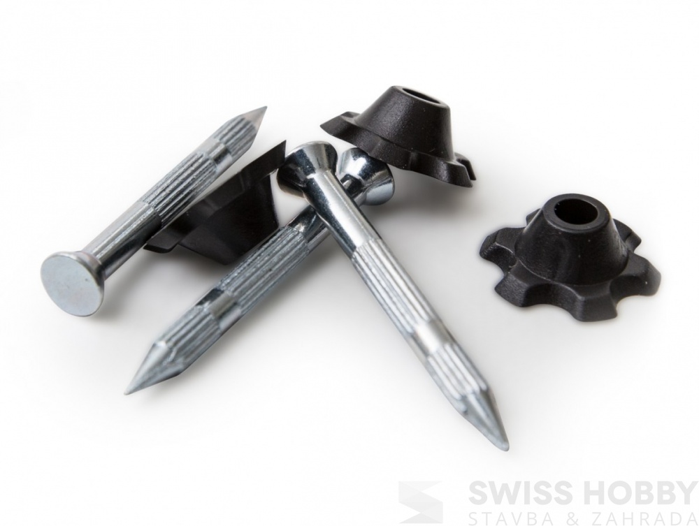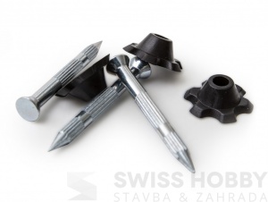 Kalené hřeby a podložky pro upevnění nopové fólie.