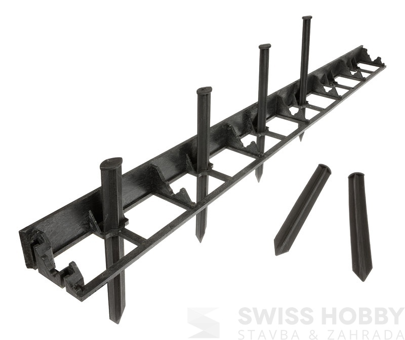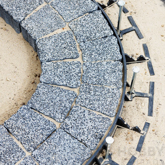 Pro fixaci obrubníku je nutné dokoupit plastové nebo kovové hřeby (viz "Příbuzné zboží"). Pro měkké podloží (např. zemina) jsou vhodné plastové hřeby geoPIN, pro pevnější podloží (jíl, zhutněný podklad) jsou vhodné kovové hřeby geoNAIL.