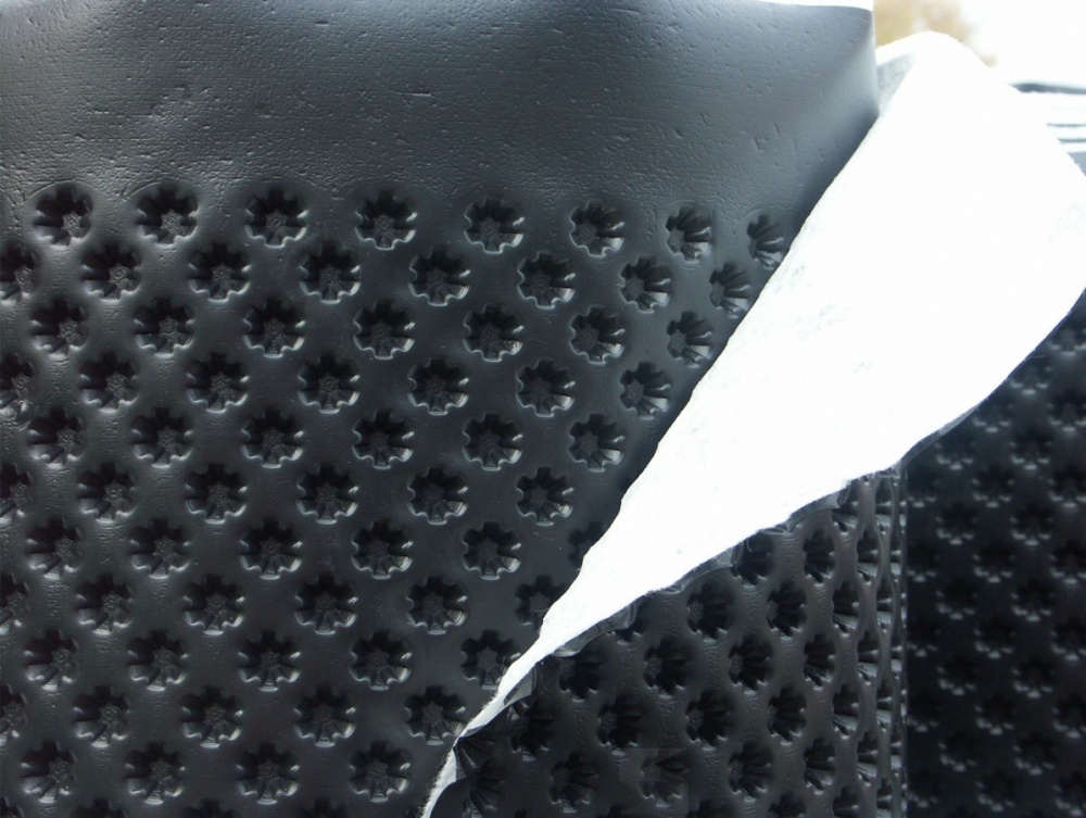 Nopová fólie s nakašírovanou filtrační geotextilií pro dlouhodobé zajištění drenážní schopnosti. Textilie zabraňuje, aby se mezery mezi nopy zanesly a tím se snížila funkčnost celého drenážního systému.