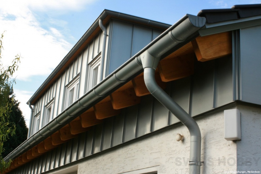 Okapový půlkulatý střešní žlab z pozinkovaného plechu - kontinuálně tvářený za studena. Základní prvek pro odvod vody ze střechy.