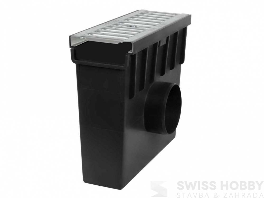 Plastová vpusť A 15 s pozinkovanou mříží - Sběrná vpusť k lineárním žlabům s mříží z pozink oceli a únosností 1,5 tuny.