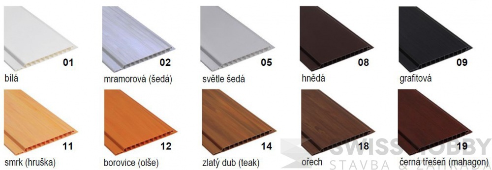Kvalitní plastové palubky skladebné šířky 10 cm. Tyto palubky a profily jsou probarvené přímo v hmotě.