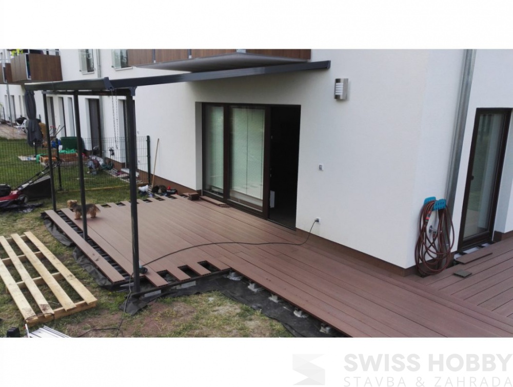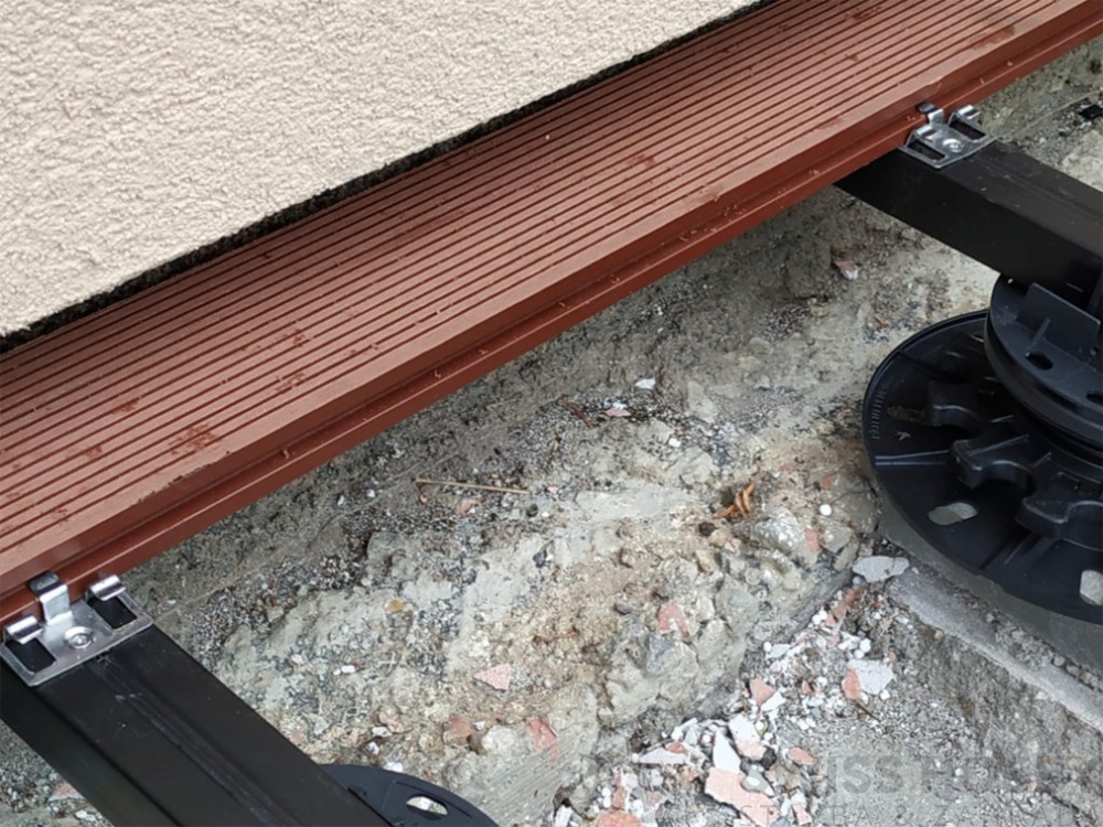 Terasa se pokládá na štěrkové lože, které je ohraničeno betonovým základem. Štěrkové lože samo působí jako drenážní systém. Nosiče by se měly pokládat rovnoběžně se spádem terasy. Je důležité dodržet vzdálenost mezi nosiči, kterou uvádí výrobce. Pokud máme připravené nosiče, začínáme prvním prknem a pomocí tzv. startovacích klipů se přichytí první prkno. Je důležité neustále kontrolovat požadovaný spád, směr a srovnávat nosiče tak, aby vše bylo dobře podložené. Poté, co se přichytí první prkno, tak se začnou používat tzv. standardní klipy, kterými se z druhé strany prkno přichytí a pokračuje se postupně dalšími prkny v řadě za sebou. Nářadí: pila na dřevo, vrtáky. Ukončovací lišta se přichytává pomocí např. nerez. vrutů V2A, kde si předvrtáte otvor 4 mm.