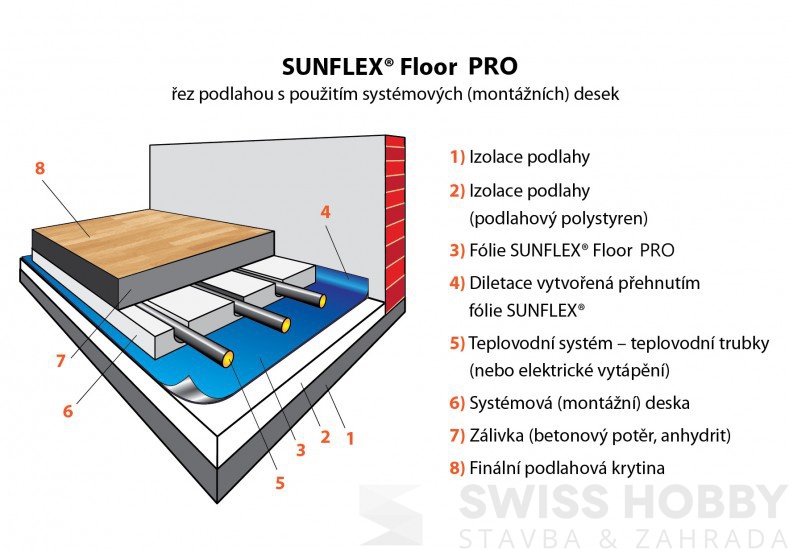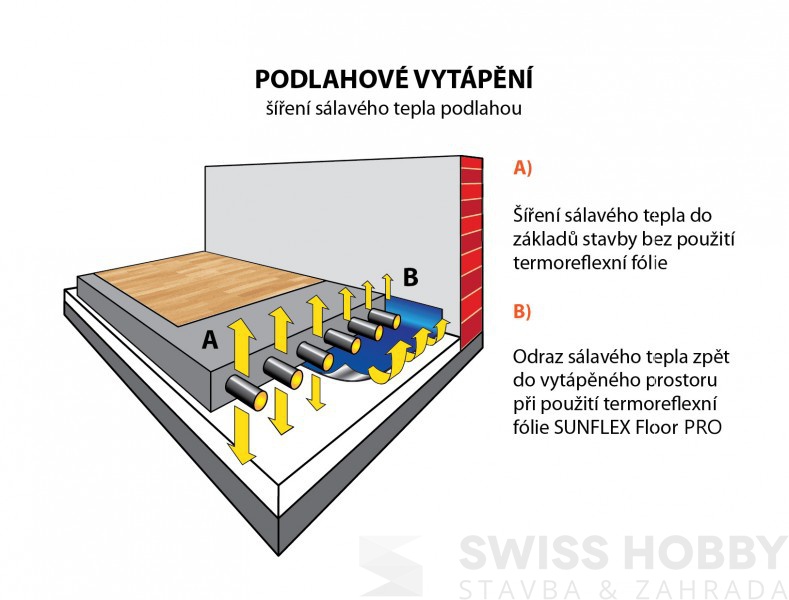 Podlahová reflexní fólie Tart SUNFLEX Floor PRO - základ nové fólie tvoří čtrnáctivrstvá bublinková fólie s průměrem bublinek 15 mm (oproti 7 mm), která výslednou tloušťku podlahové fólie zvyšuje na dvojnásobek (zhruba na 7 mm).Reflexní vrstva je nalaminována fóliíí z čistého, vysoce lesklého hliníku. Tyto faktory mají výrazný pozitivní vliv na množství odráženého tepla a tím úsporu nákladů.