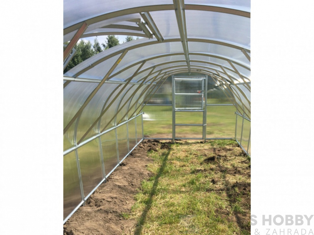 Jeden z nejodolnějších skleníků obloukového typu. Prostorný a pevný zahradní skleník z polykarbonátu a robustní konstrukce vyrobené z bezúdržbového ocelových profilů tloušťky 1 mm, které jsou opatřený ochranným zinkovým nátěrem. Zesílená vrstva zinku (275 g/m2) zajišťuje dlouhodobou odolnost korozi a díky tomu skleník splňuje požadavky na nejvyšší kvalitu. Opláštění tvoří UV odolný dutinkový polykarbonát o tloušťce 4 nebo 6 mm. Tento skleník není nutné kotvit na betonové základy. Skleník má v jednom čele půlené dveře. Je možné je otevřít celé nebo používat jen větrací okénko v horní části. Na bočních stranách konstrukce je možné instalovat závěsné očko s poutkem (součást balení), pro aretaci dveří v otevřené poloze. V zadním čele je druhé větrací okno. Do zadní části je možné dokoupit spodní díl dveří a skleník zprůchodnit. Ke skleníkům delším než 2 metry doporučujeme zakoupit střešní ventilační okna. K nim je možné zakoupit automatický otvírač, který bude sám střešní okno ,,obsluhovat,, dle aktuální teploty ve skleníku.