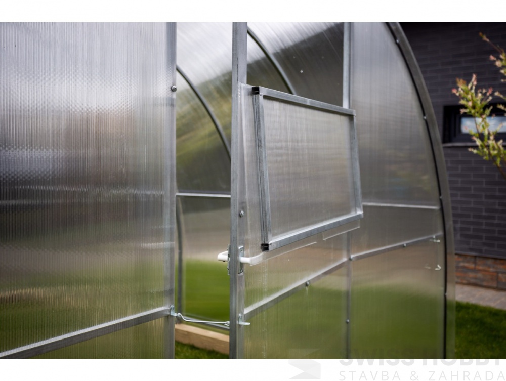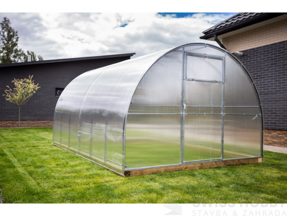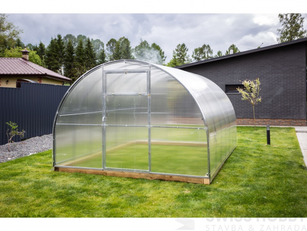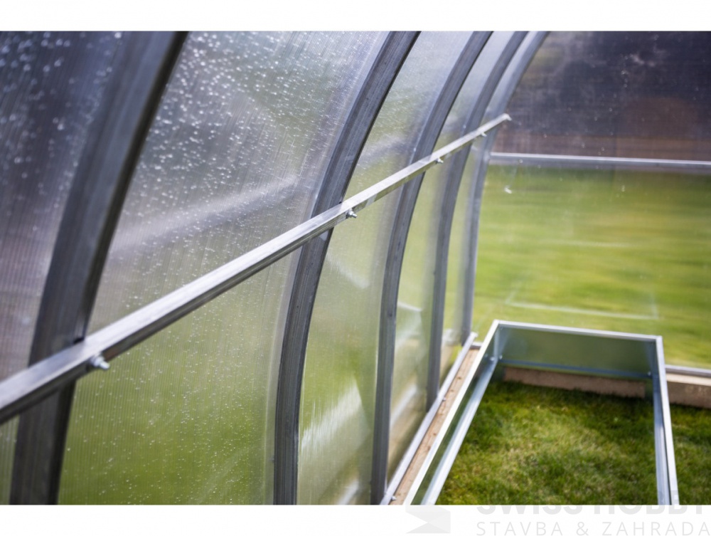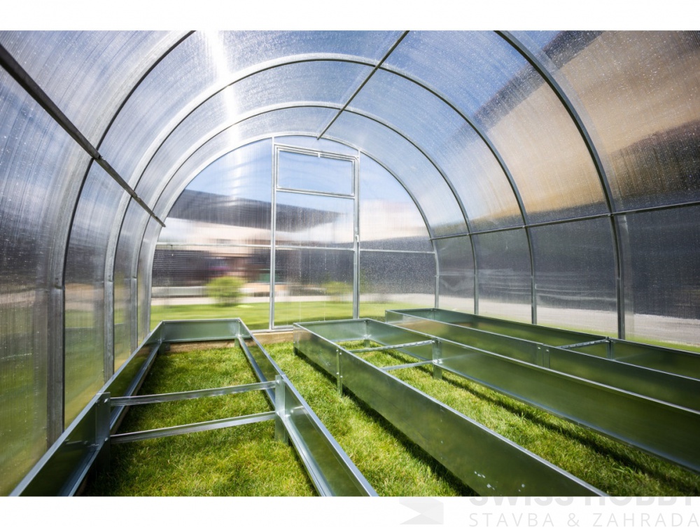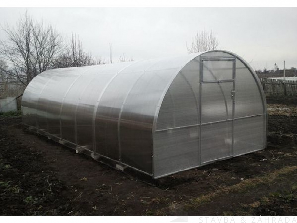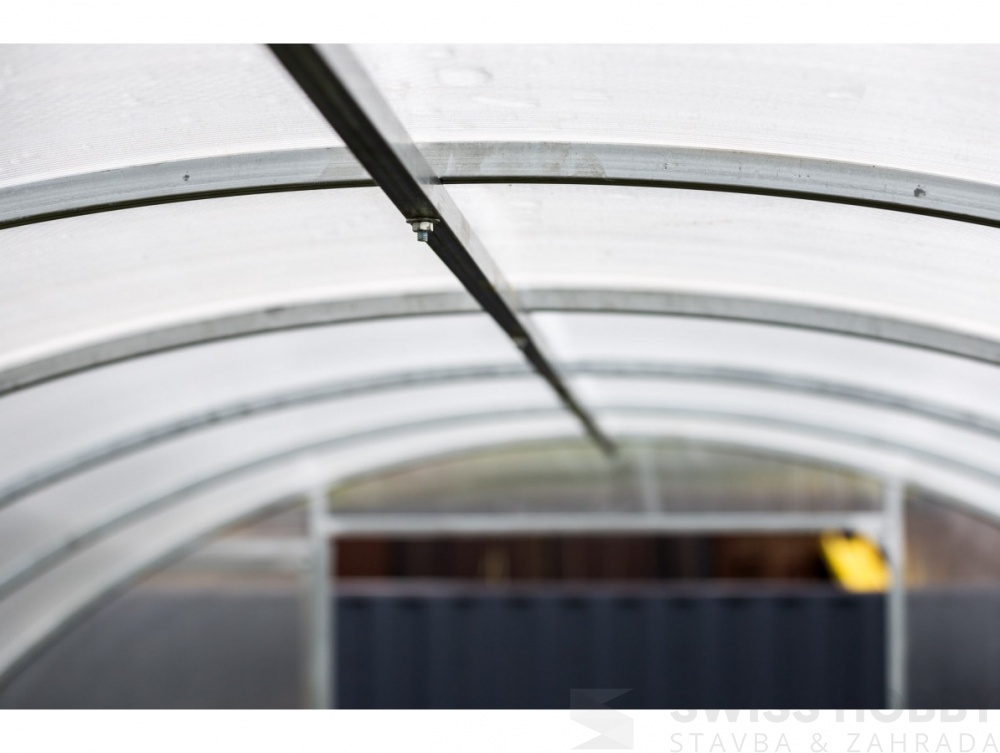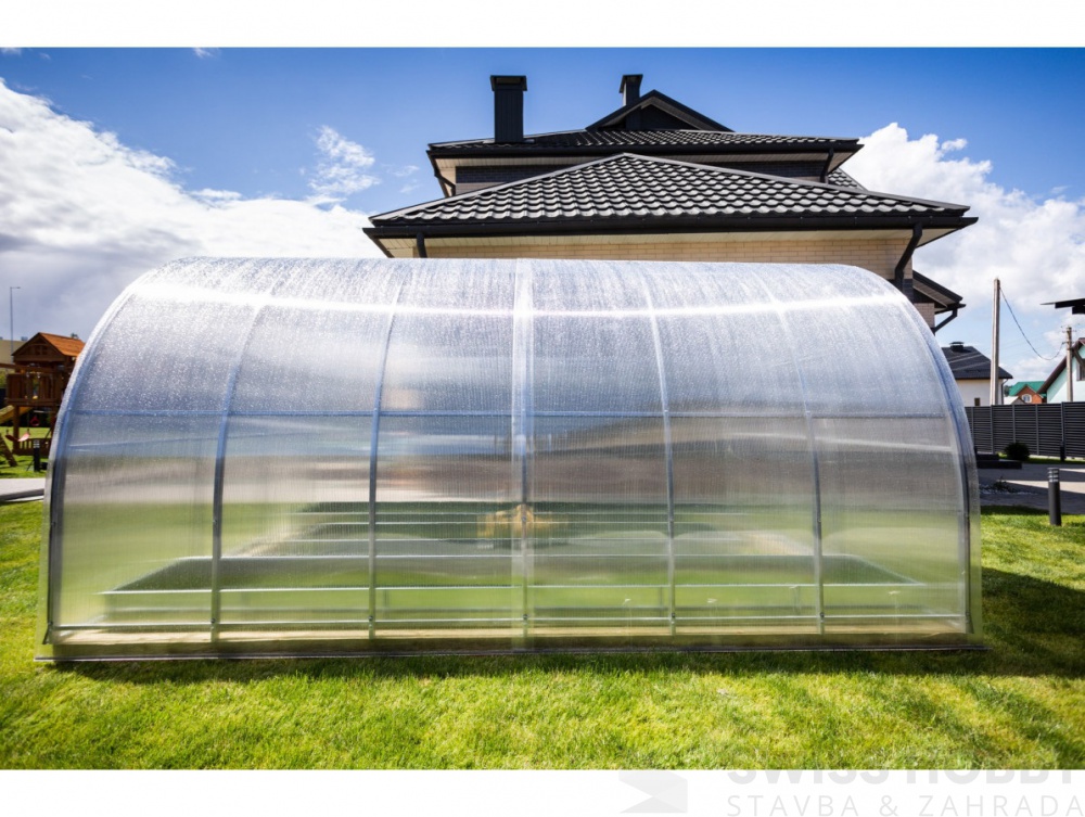 Obloukový skleník s zesílenou jeklovou konstrukcí. Opláštění je tvořeno zdravotně nezávadným UV odolným polykarbonátem.